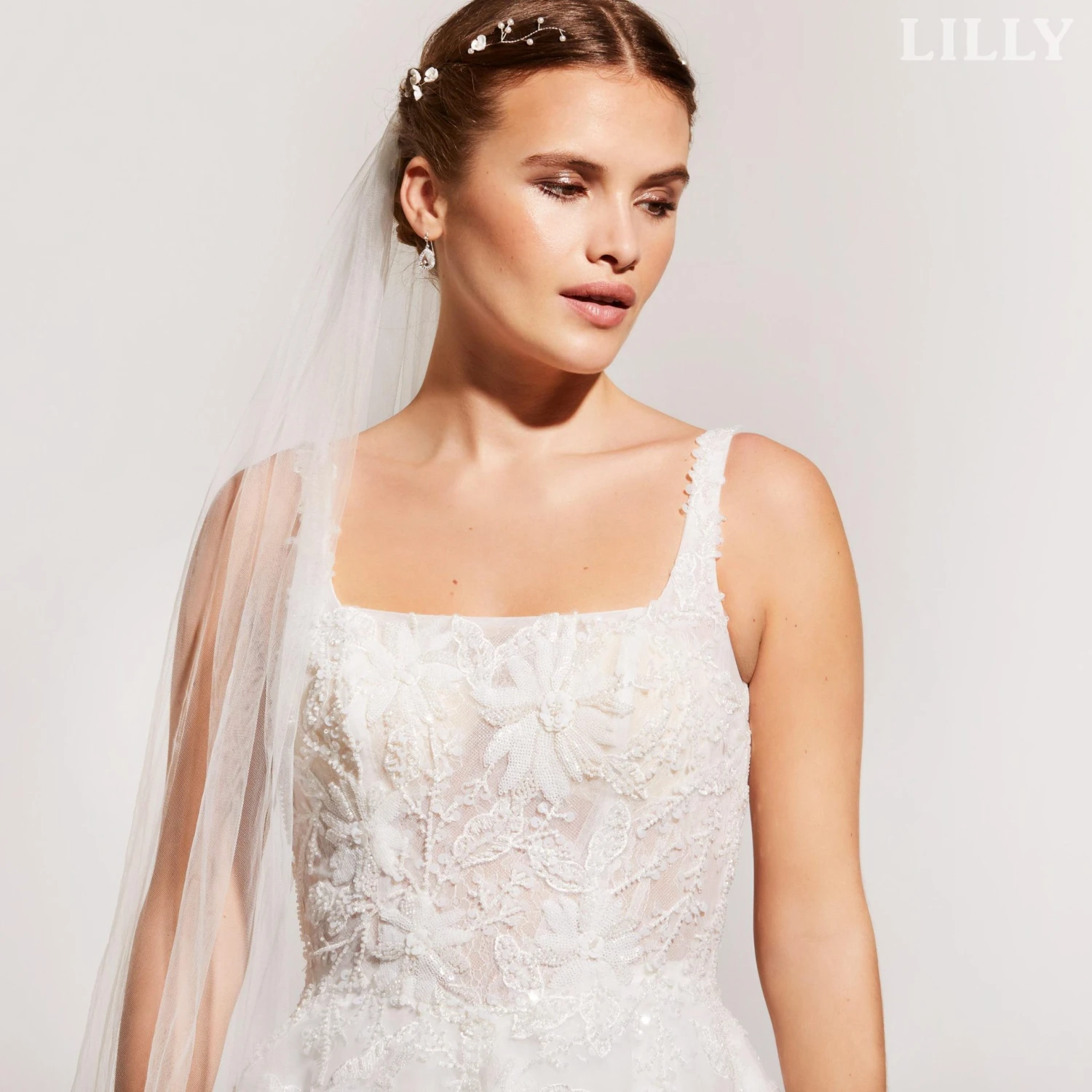La « Charlotte » est une robe de mariée de style A-line, dotée d’un corsage délicatement brodé qui se marie à merveille avec sa jupe volumineuse en tulle. Les détails délicats de dentelle et l’encolure en V ajoutent une touche de féminité supplémentaire.