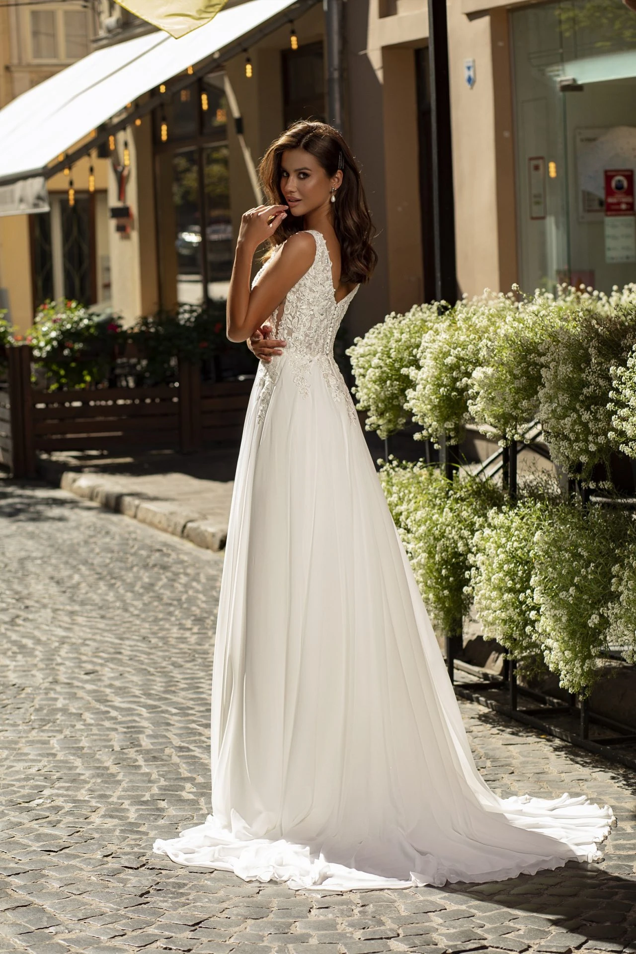 - Avantage : Robe Blanche Mariage Civil col V, traîne, perles, bretelles