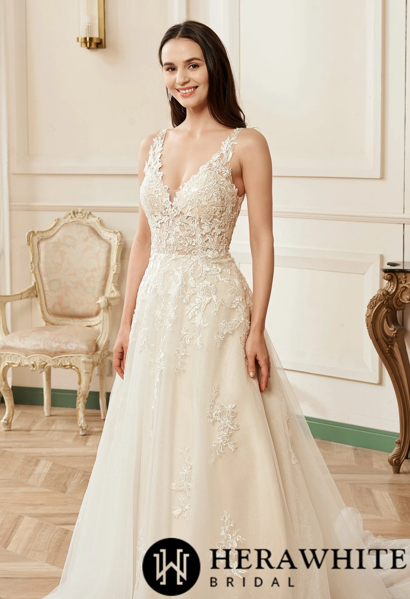 - Avantage : Robe de mariée A décolleté V et bretelles en dentelle dos nu, motifs floraux, traîne, sequins