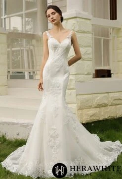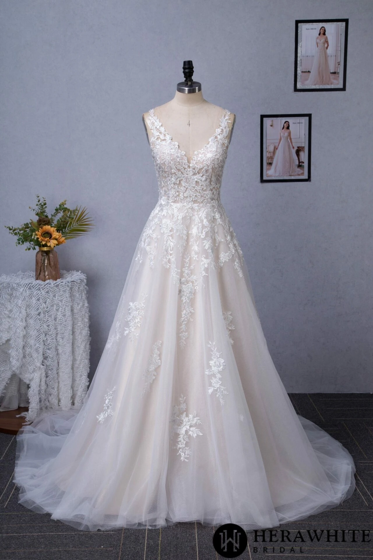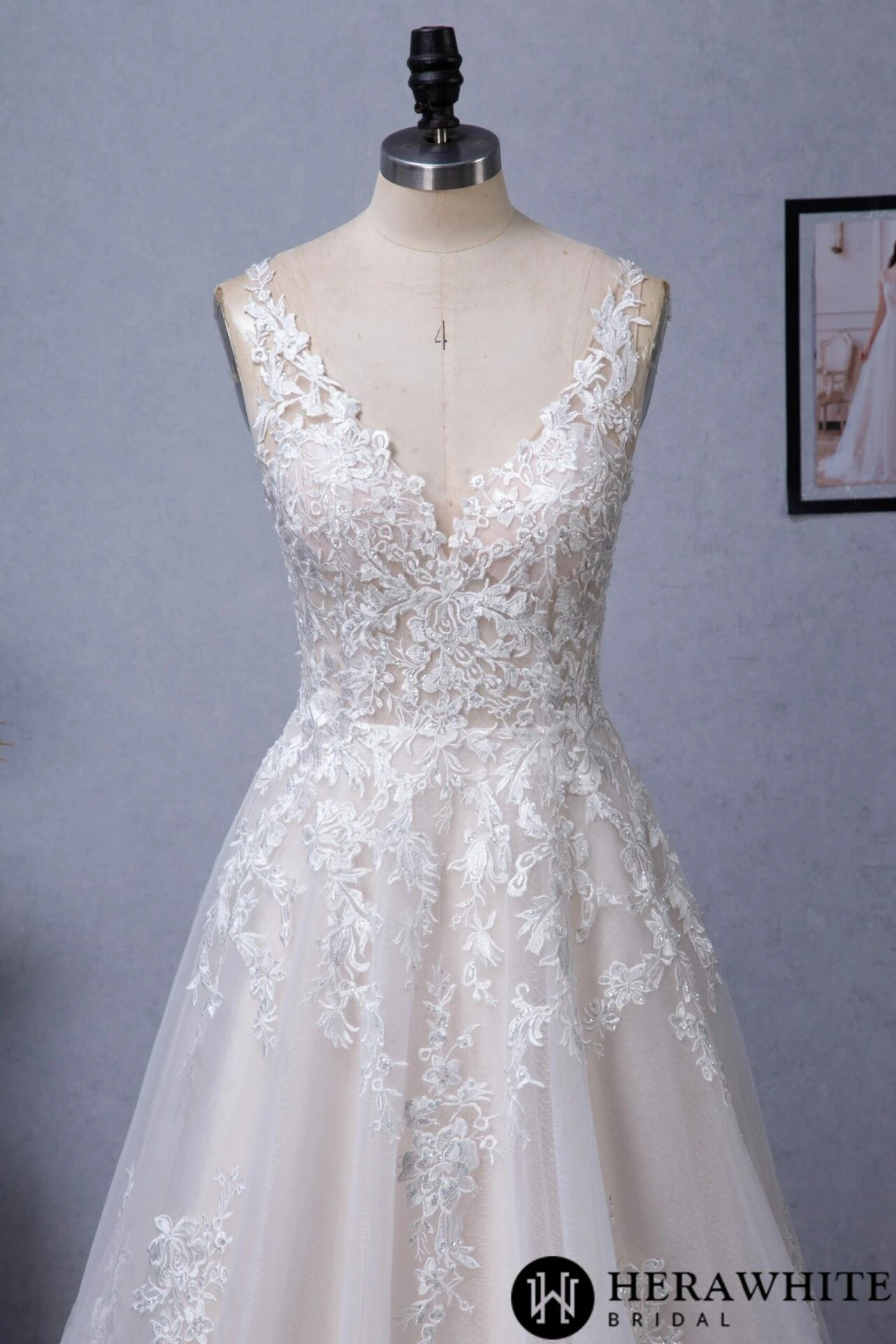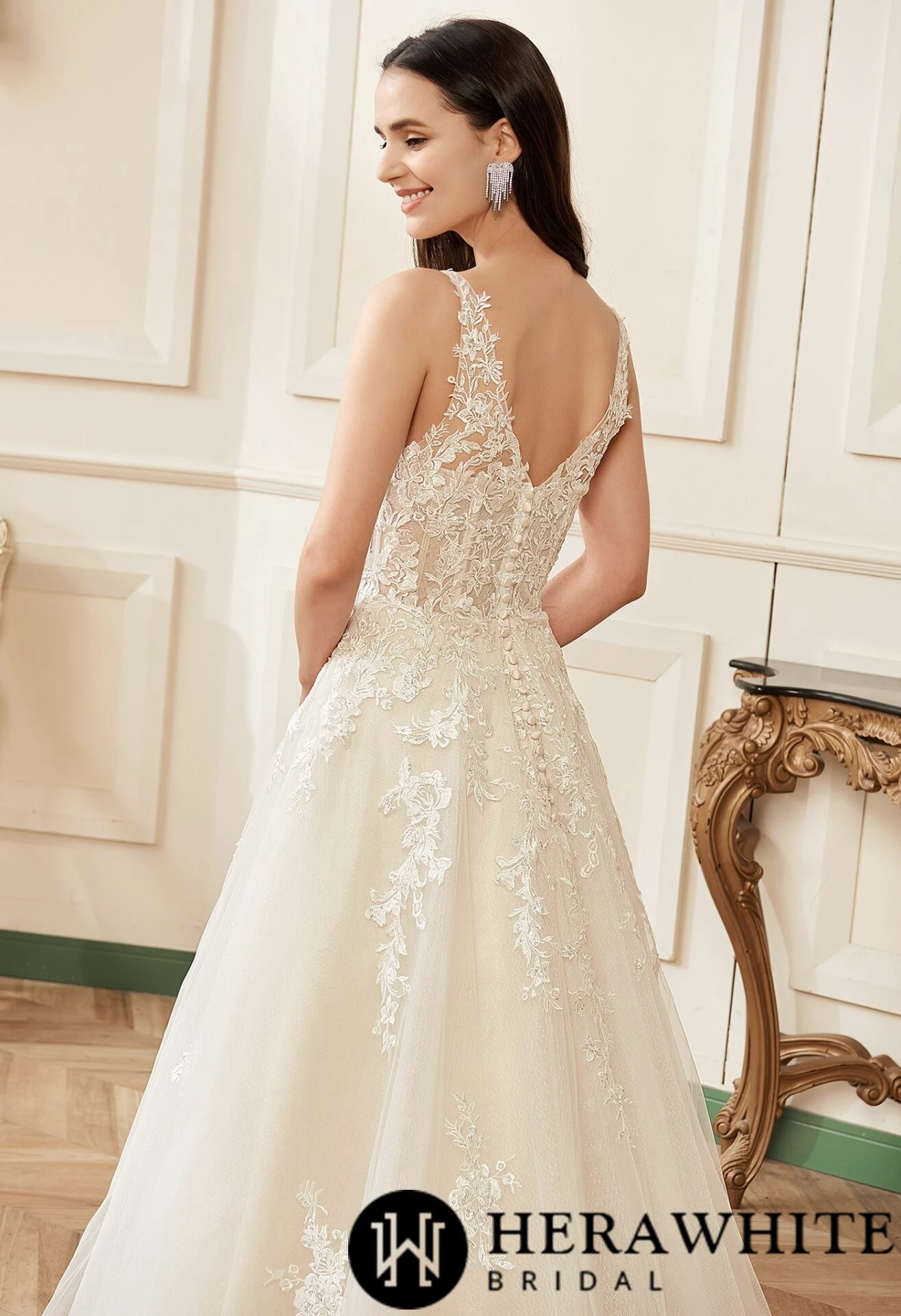 La Robe de mariée A décolleté V et bretelles en dentelle vous offrira un magnifique col en V à illusion. Son haut en corsage orné d’appliques en dentelle florale descend avec élégance sur une jupe A pour finir sur une légère traîne.
