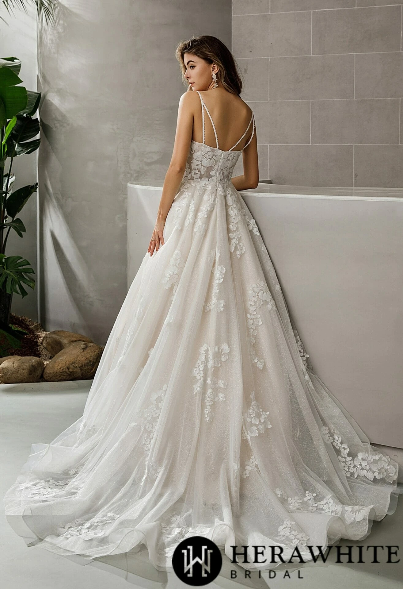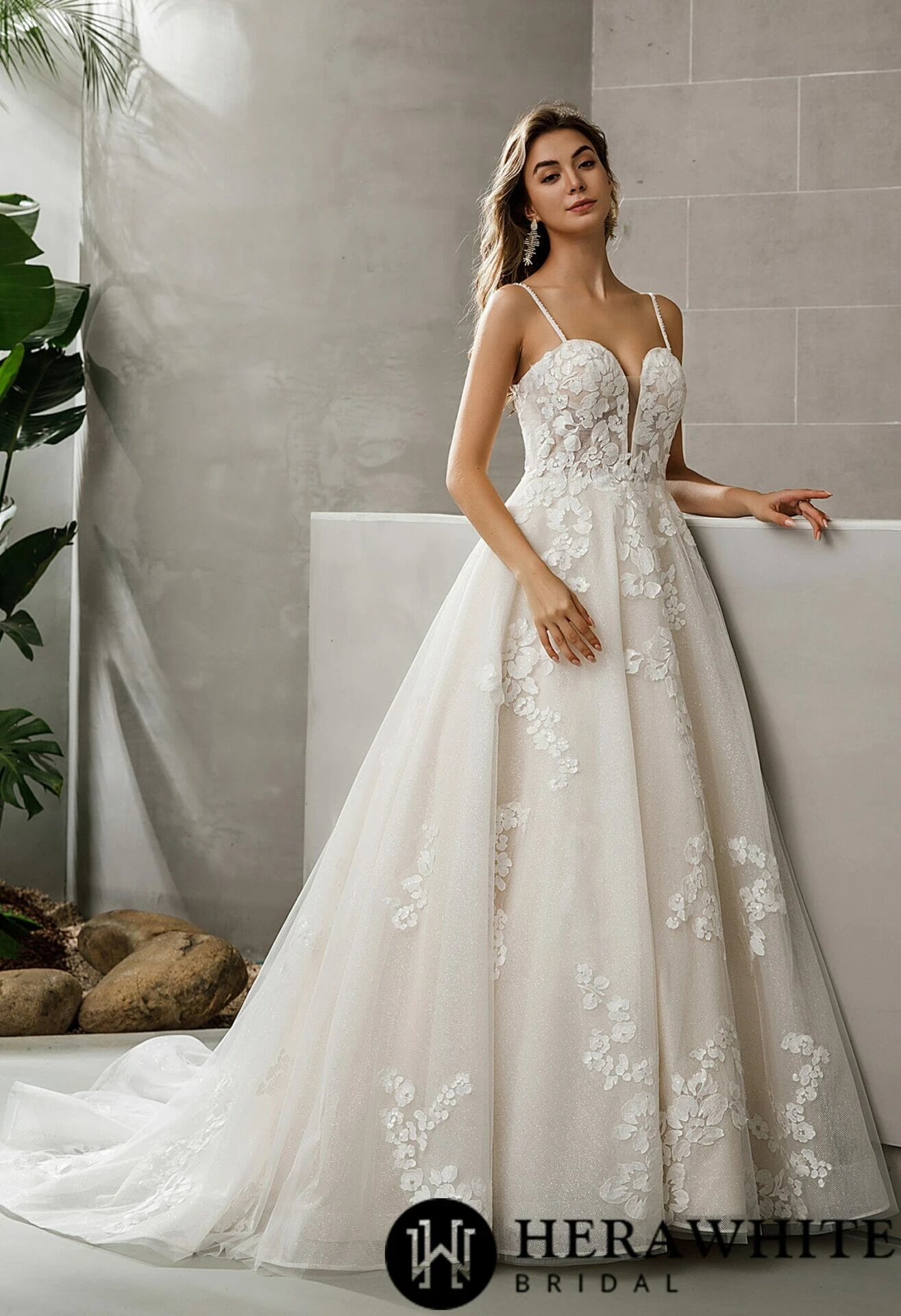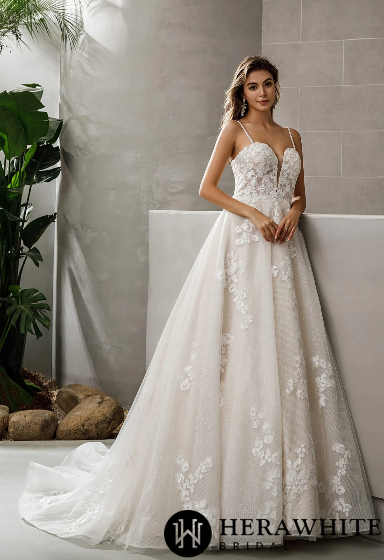 Cette superbe Robe de mariée A en dentelle pailletée col cœur plongeant n’attend que vous ! Fraîche et féminine, cette robe de tulle A est brodée de délicats motifs floraux, présente un décolleté plongeant en cœur et des bretelles spaghetti perlées. Le tulle pailleté en dessous ajoute une touche d’éclat irrésistible.