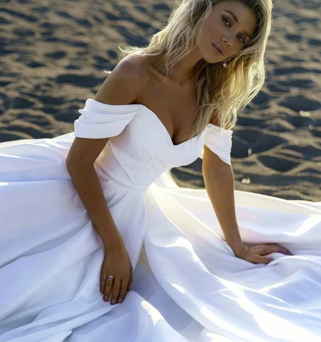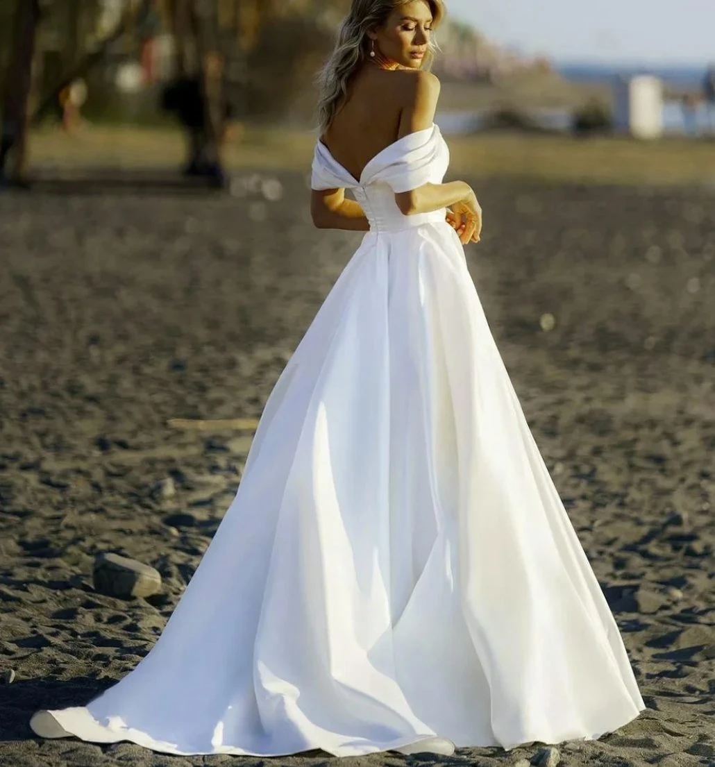 - Avantage : Robe De Mariée Col Bardot Et Longue Traîne manches tombantes, plis, dos nu, traîne