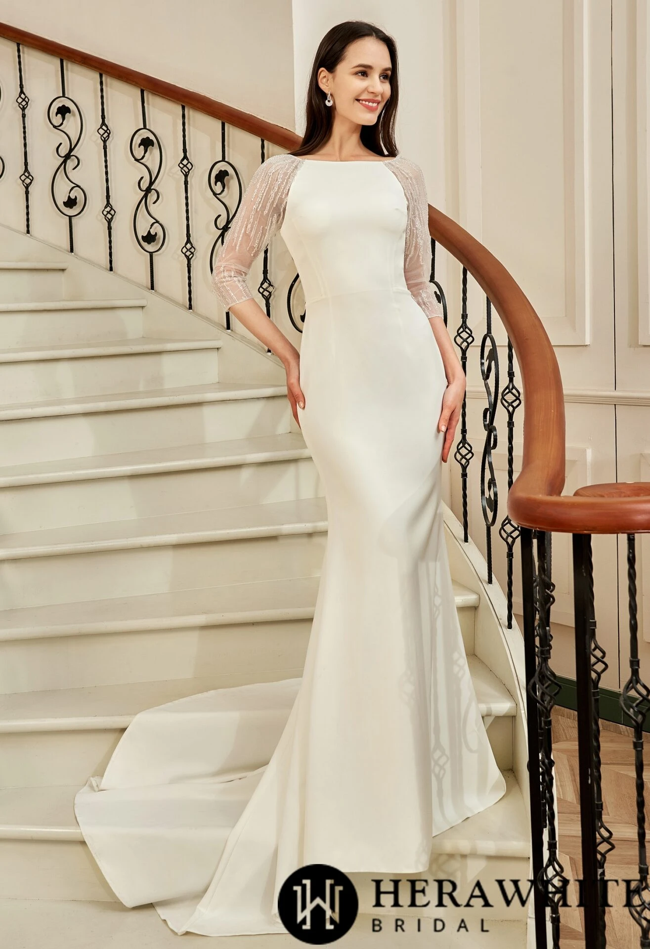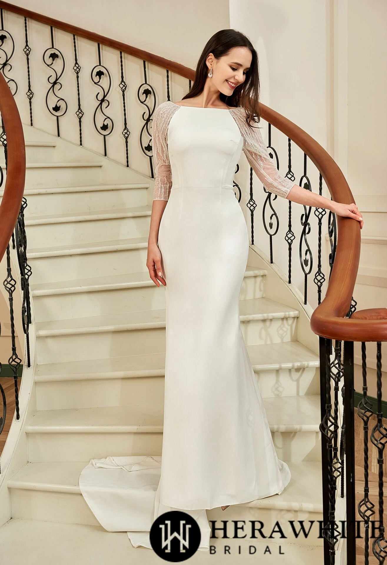 - Avantage : Robe de mariée en crêpe avec encolure bateau traîne et dos en perles d’illusion manches 3/4, perles