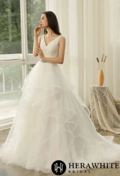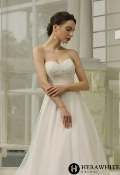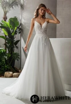 Moderne et romantique, cette Robe de mariée en satin perlé à décolleté en V profond et poches en ligne A présente un décolleté en V profond illusionné, orné de dentelle festonnée avec des perles dédiées et des bretelles spaghetti perlées. De la dentelle argentée embellit le corsage qui tend vers un bas de dos sexy tandis qu’une jupe de rêve en satin avec des poches et une traîne en forme de chapelle complète le look de la mariée.