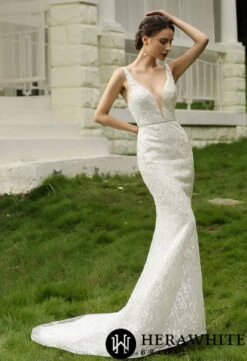 - Avantage : Robe de mariée en satin perlé à décolleté en V profond et poches en ligne A fines bretelles, broderies, sequins, traîne, dos nu, ceinture