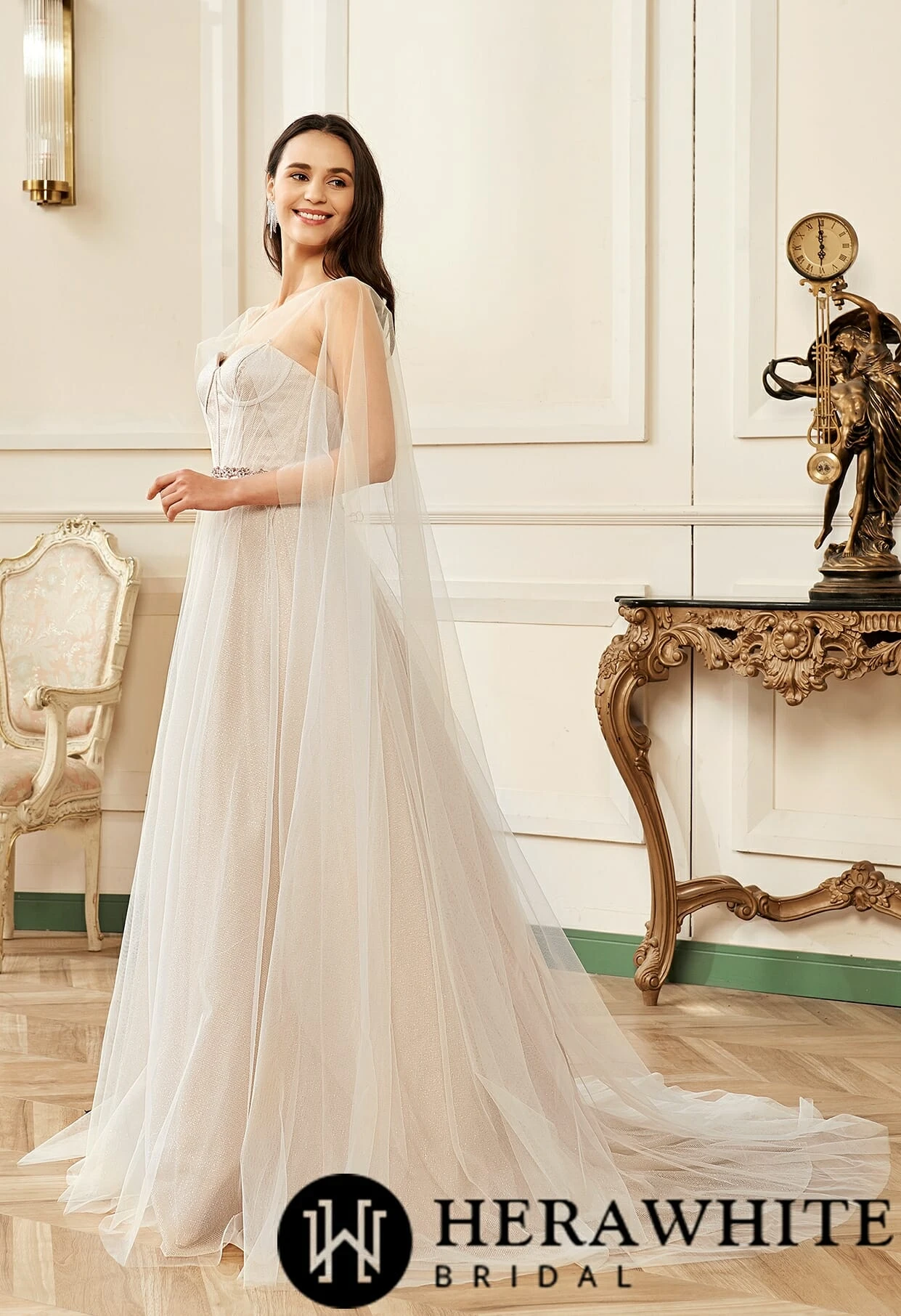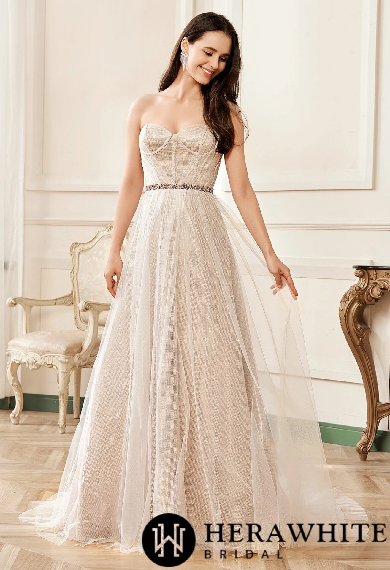 Cette magnifique Robe de mariée en tulle avec corset rose nude est faite pour vous ! Cette jolie robe de mariée en forme de cœur présente un corset recouvert de tulle plissé. Le tulle couvrant la jupe évasée fini sur une légère traîne. Les bretelles de tulle détachables et la ceinture de cristal apportent une touche romantique à votre mariage.