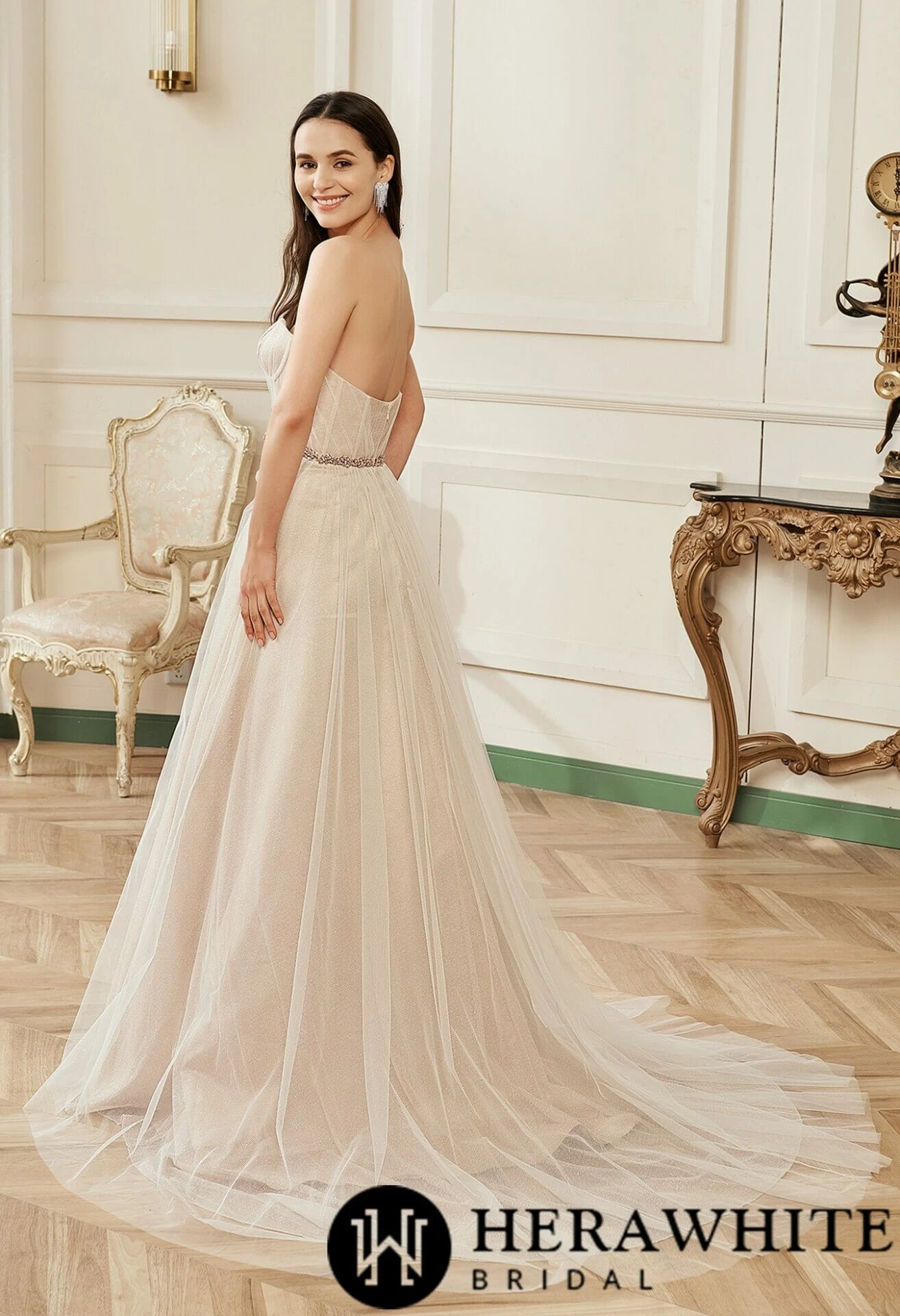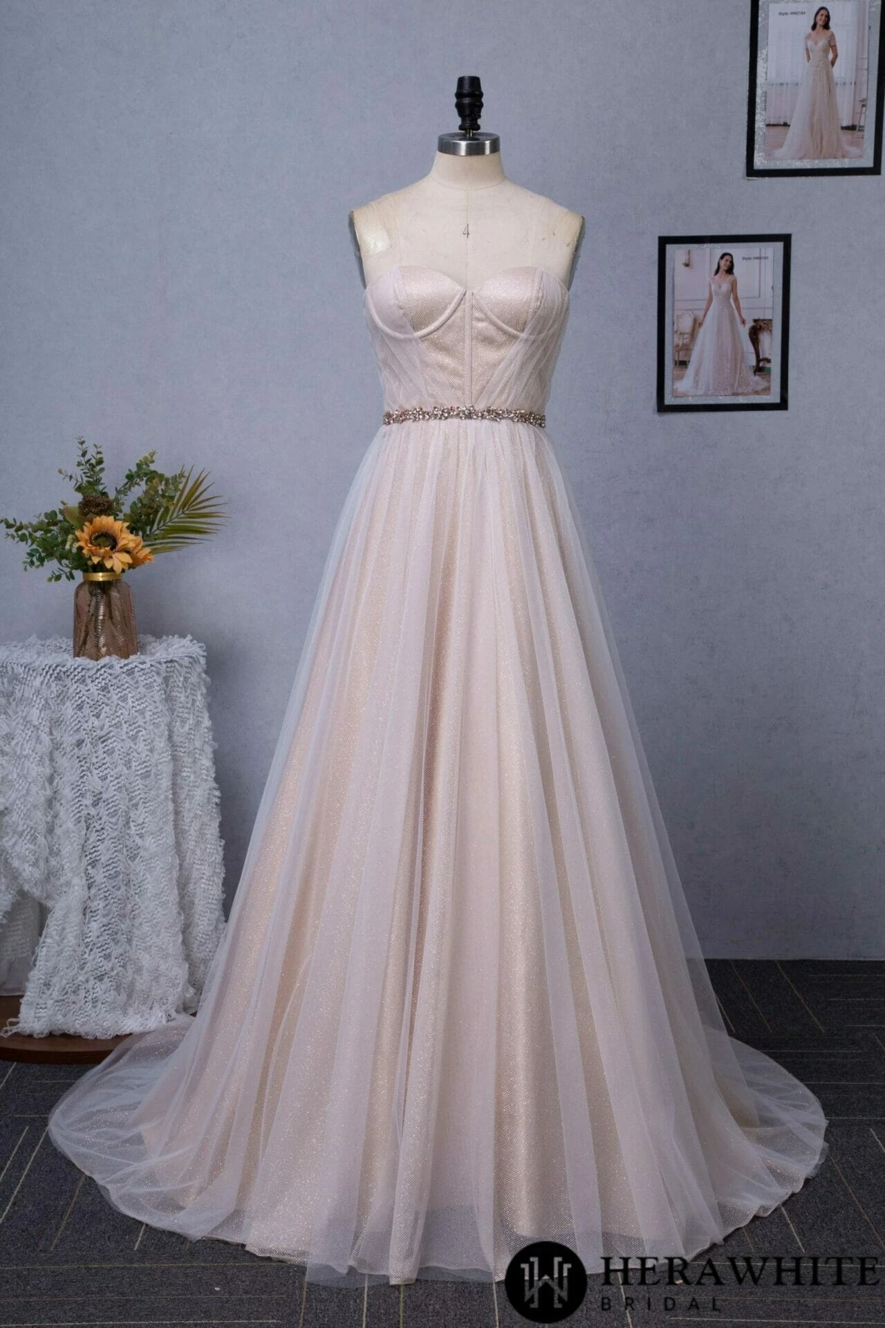 - Avantage : Robe de mariée en tulle avec corset rose nude ceinture, dos nu, fines bretelles à tulle détachable, traîne