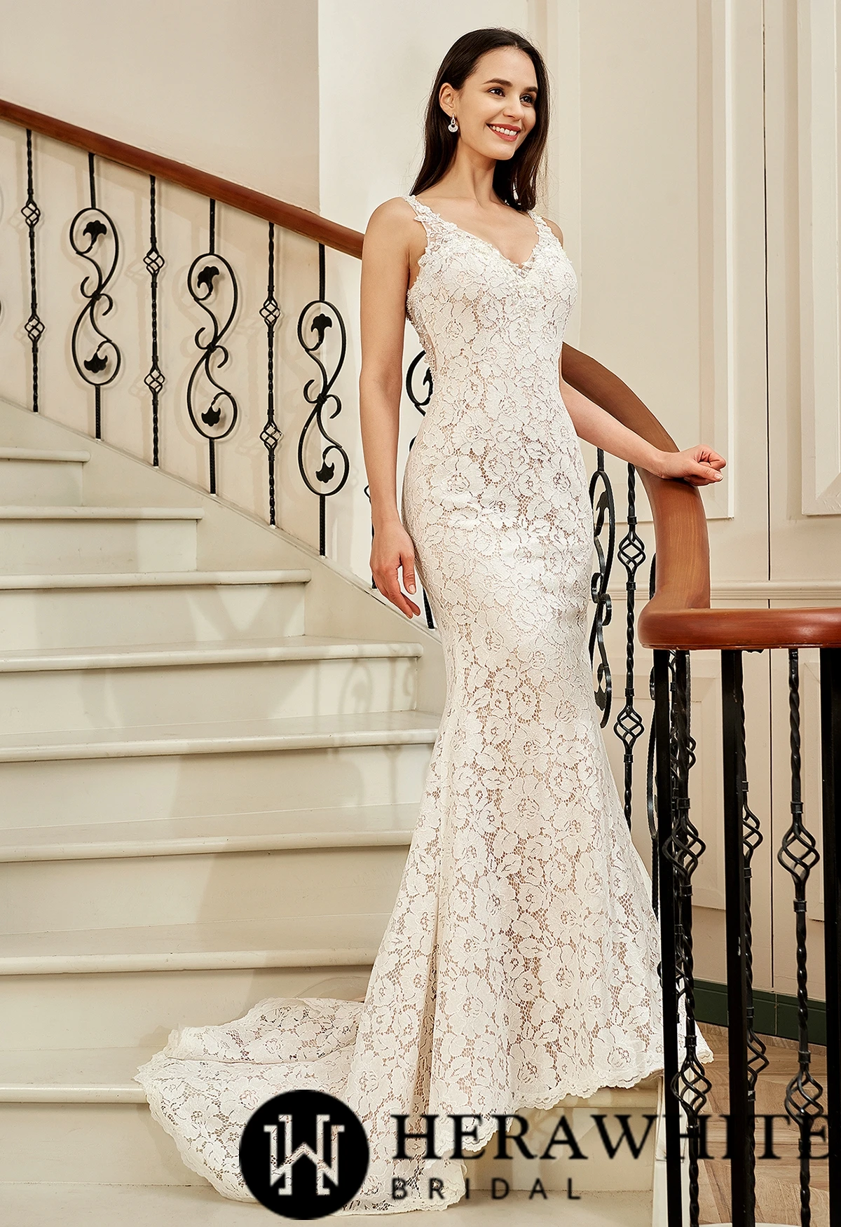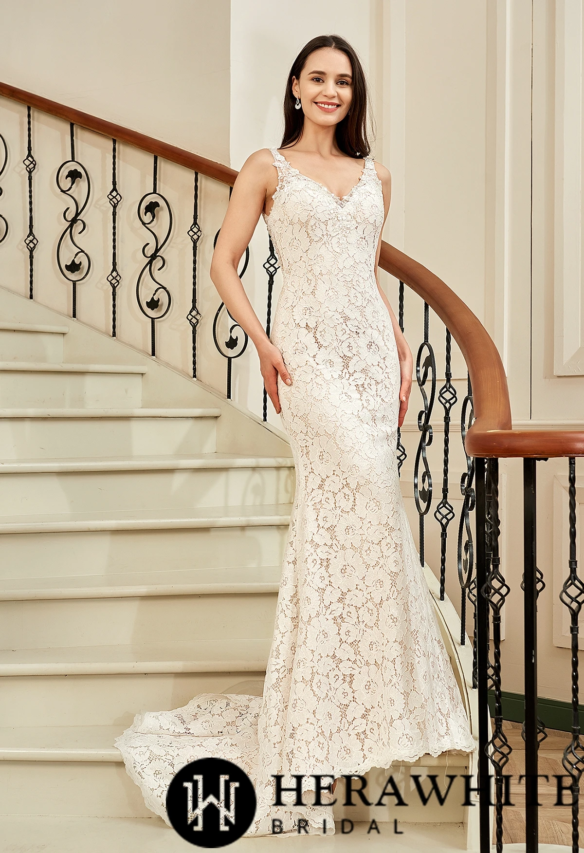 Cette élégante Robe De Mariée Fourreau A Dentelle Florale, ajustée et évasée, possède de jolis détails travaillés . Elle présente un décolleté en V garni de dentelle et de perles, un charmant dos ouvert laisse place à une légère traîne à liseré.