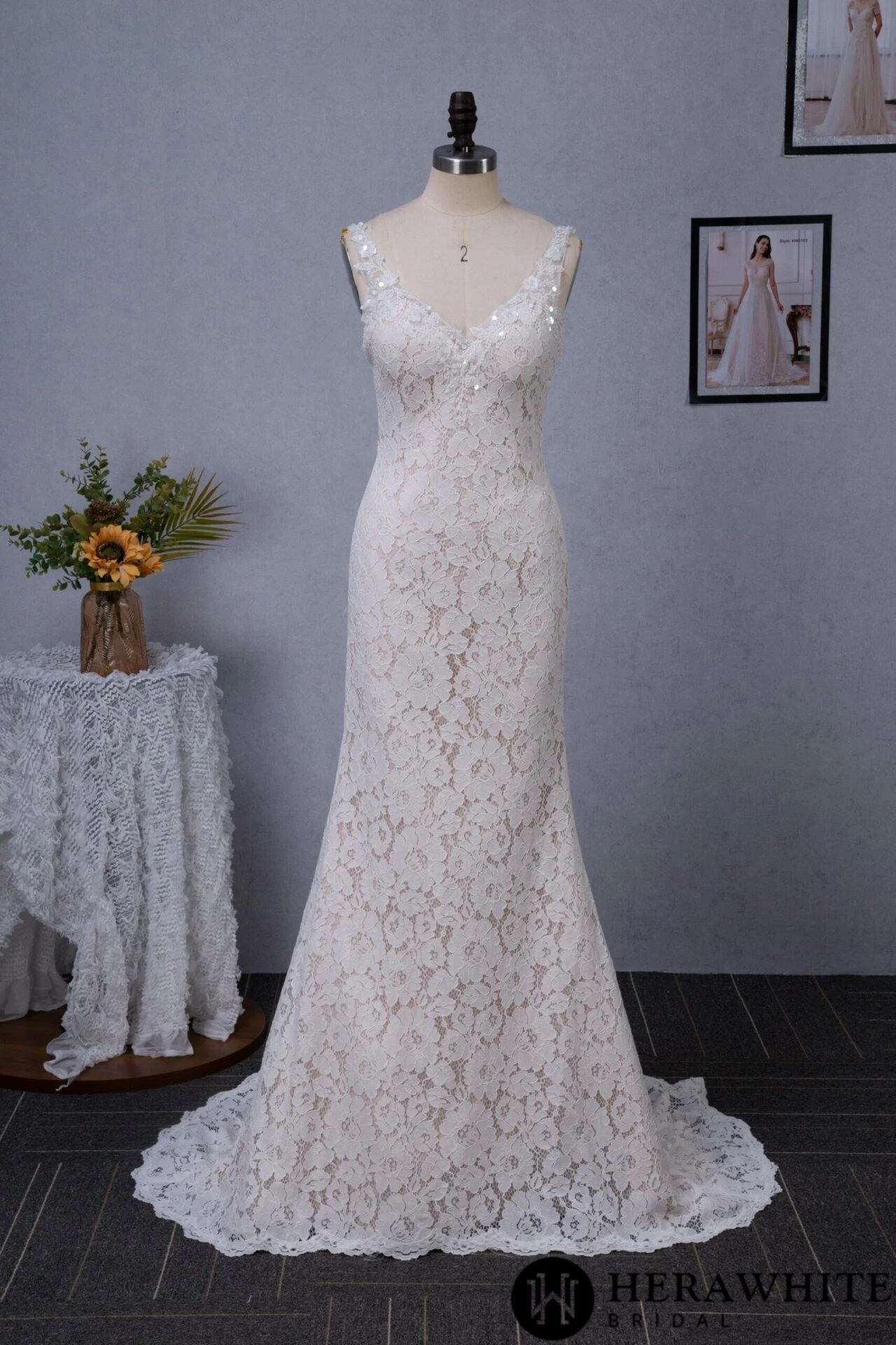 - Avantage : Robe De Mariée Fourreau A Dentelle Florale sequins, fines bretelles, dos nu, traîne, liseré, perles