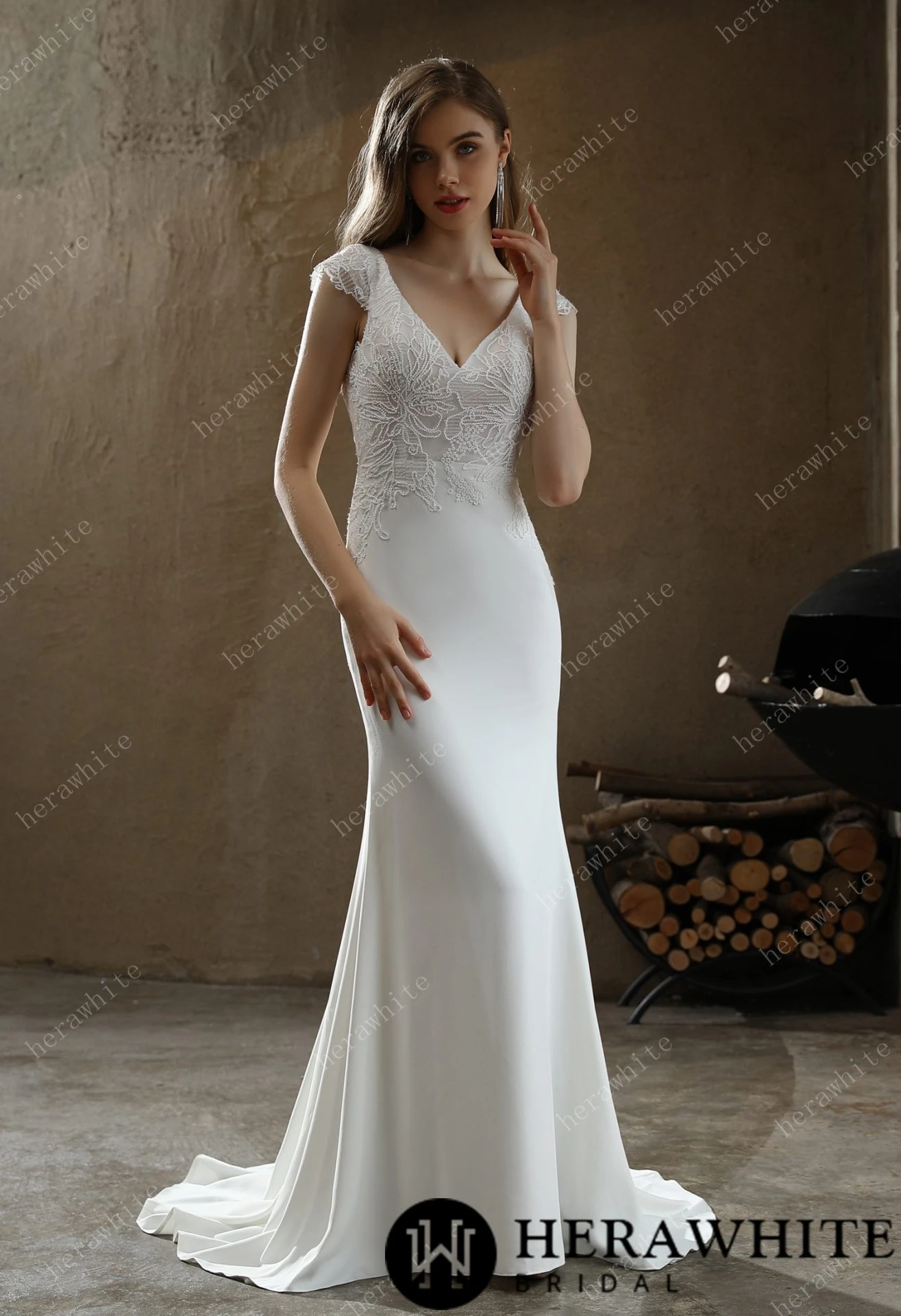 - Avantage : Robe De Mariée Fourreau Avec Jupe En Tulle manches courtes, dentelle florale, traîne, col V, tulle détachable