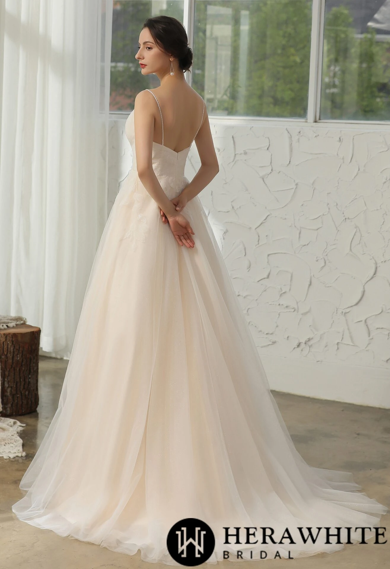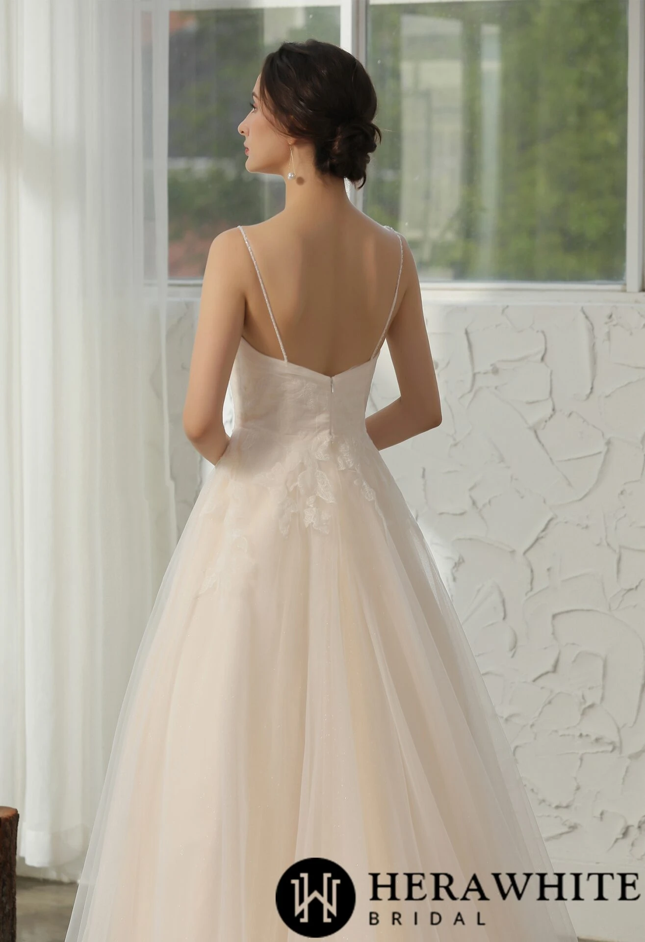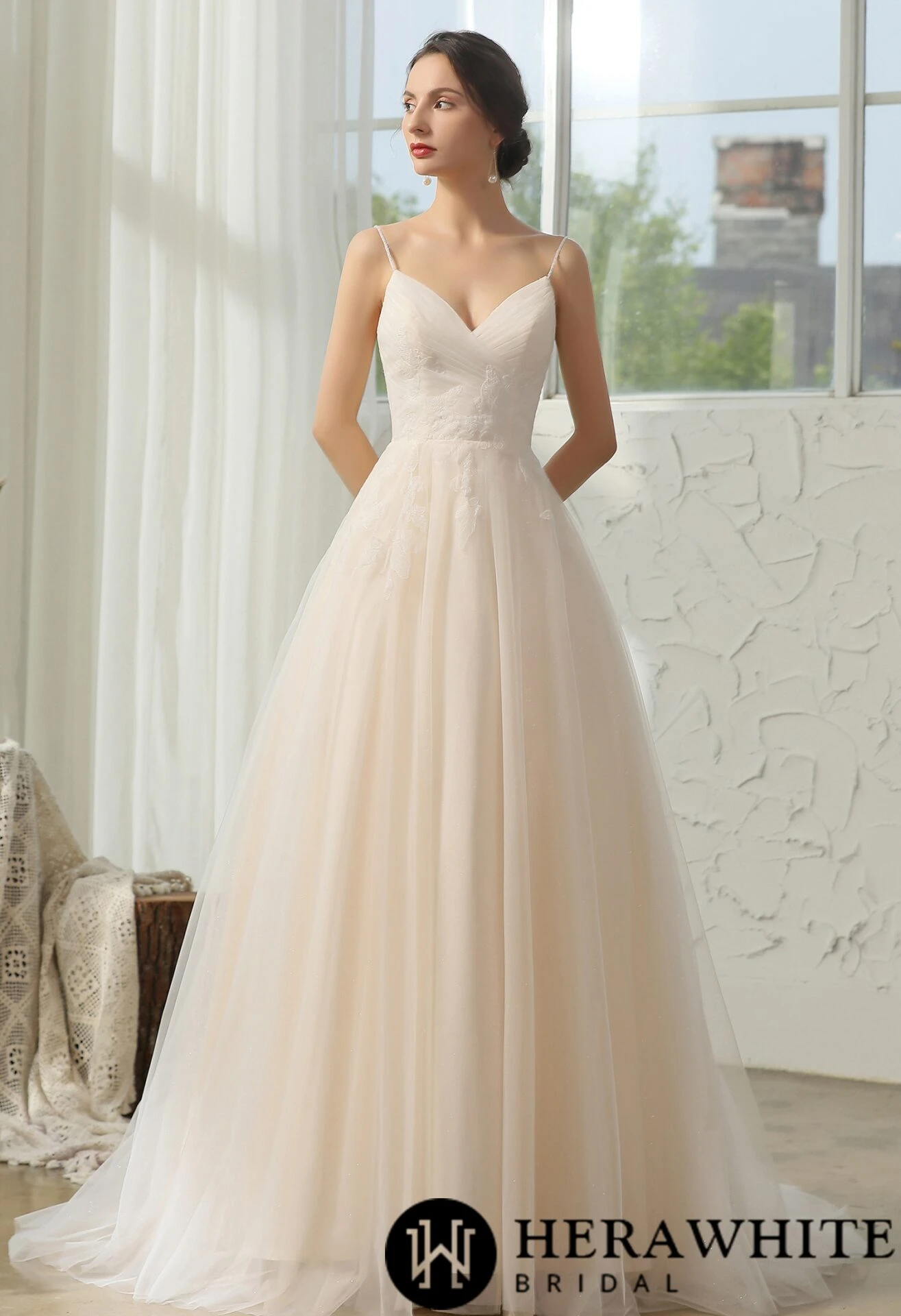 Simple et élégante, cette Robe de mariée ligne A plissée en dentelle élégante sera raffinée. Son décolleté V et ses bretelles spaghetti perlées présentent de délicates appliques en dentelle sur un corsage plissé semi-transparent. La jupe bouffante romantique de ligne A se finira sur une légère traîne chic.