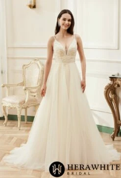 Cette splendide Robe de mariée longue en dentelle col en V et bretelles perlées est idéale pour vous ! Les délicats détails en dentelle recouverts de perles étincelantes encadrent magnifiquement l’encolure en V plongeante. Les bretelles perlées et le dos ouvert ajoutent une touche de charme à cette robe de mariée. Le motif en dentelle se promène dans le corsage et tombe sur la jupe en tulle scintillant, pour une silhouette en ligne A volumineuse et fluide.