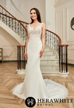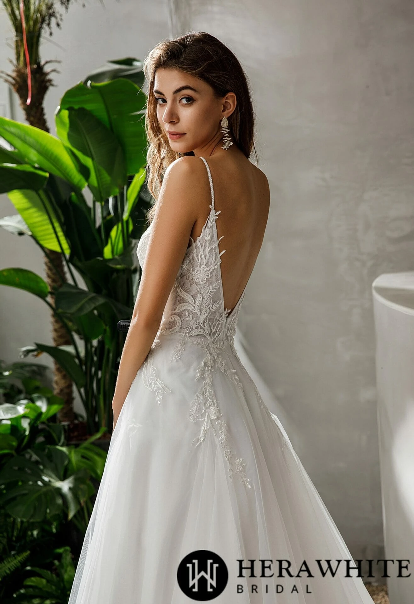 - Avantage : Robe de mariée longue en dentelle col en V et bretelles perlées dos nu, légère traîne, col V, motifs floraux