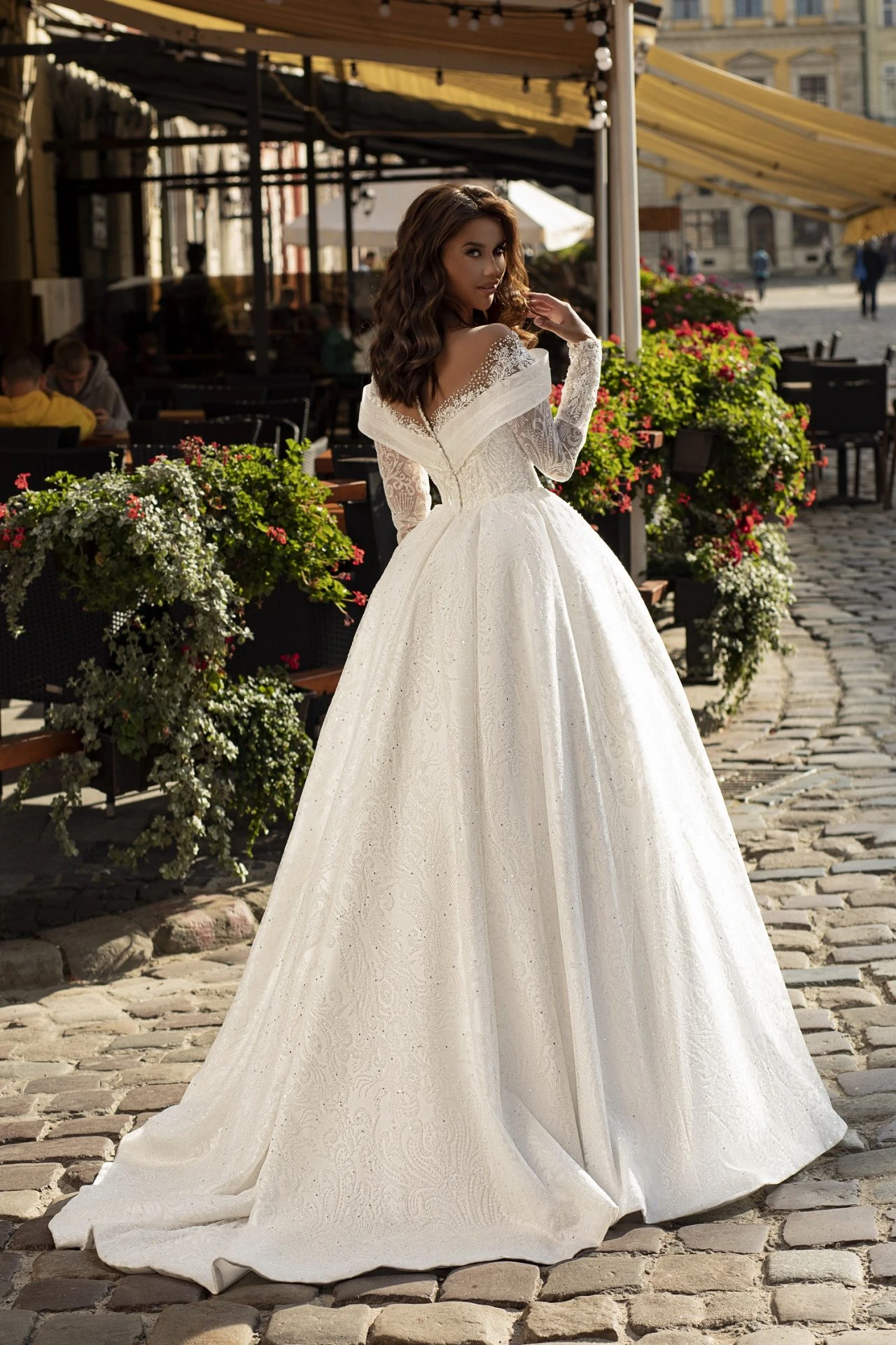 - Avantage : Robe De Mariée Princesse Luxe Blanche col V illusion, manches longues, traîne, sequins, perles
