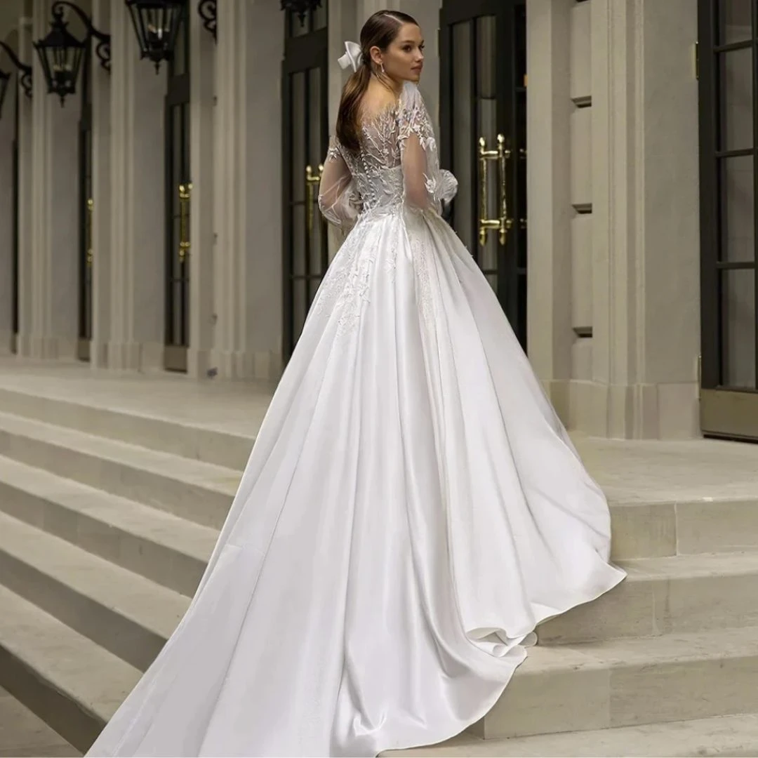 - Avantage : Robe De Mariée Princesse Scintillante Appliques Florales manches longues illusion, traîne, paillettes, sequins, ceinture