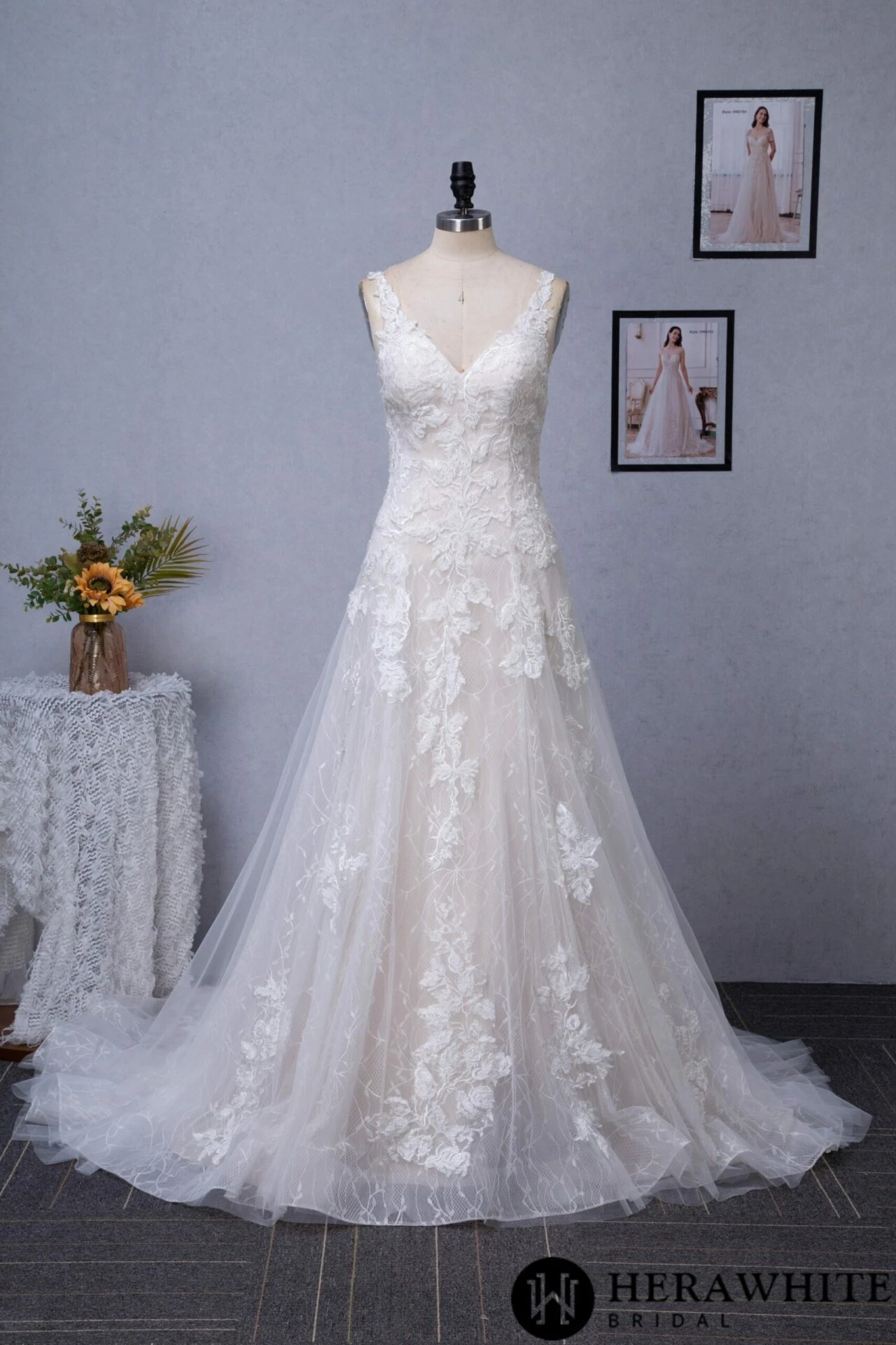 - Avantage : Robe de mariée romantique à encolure en V avec appliques florales dentelle fines à dentelle, traîne, dos nu