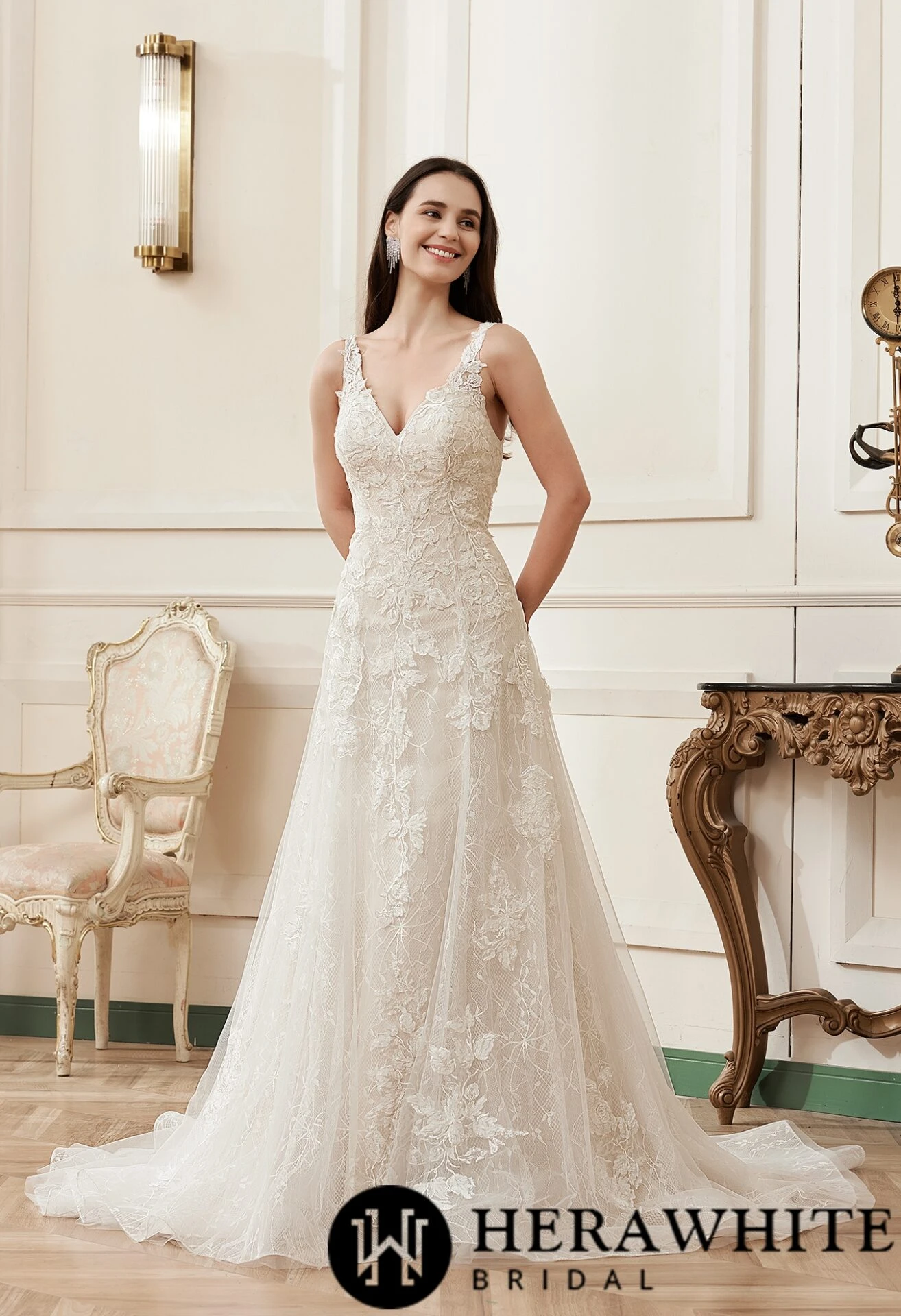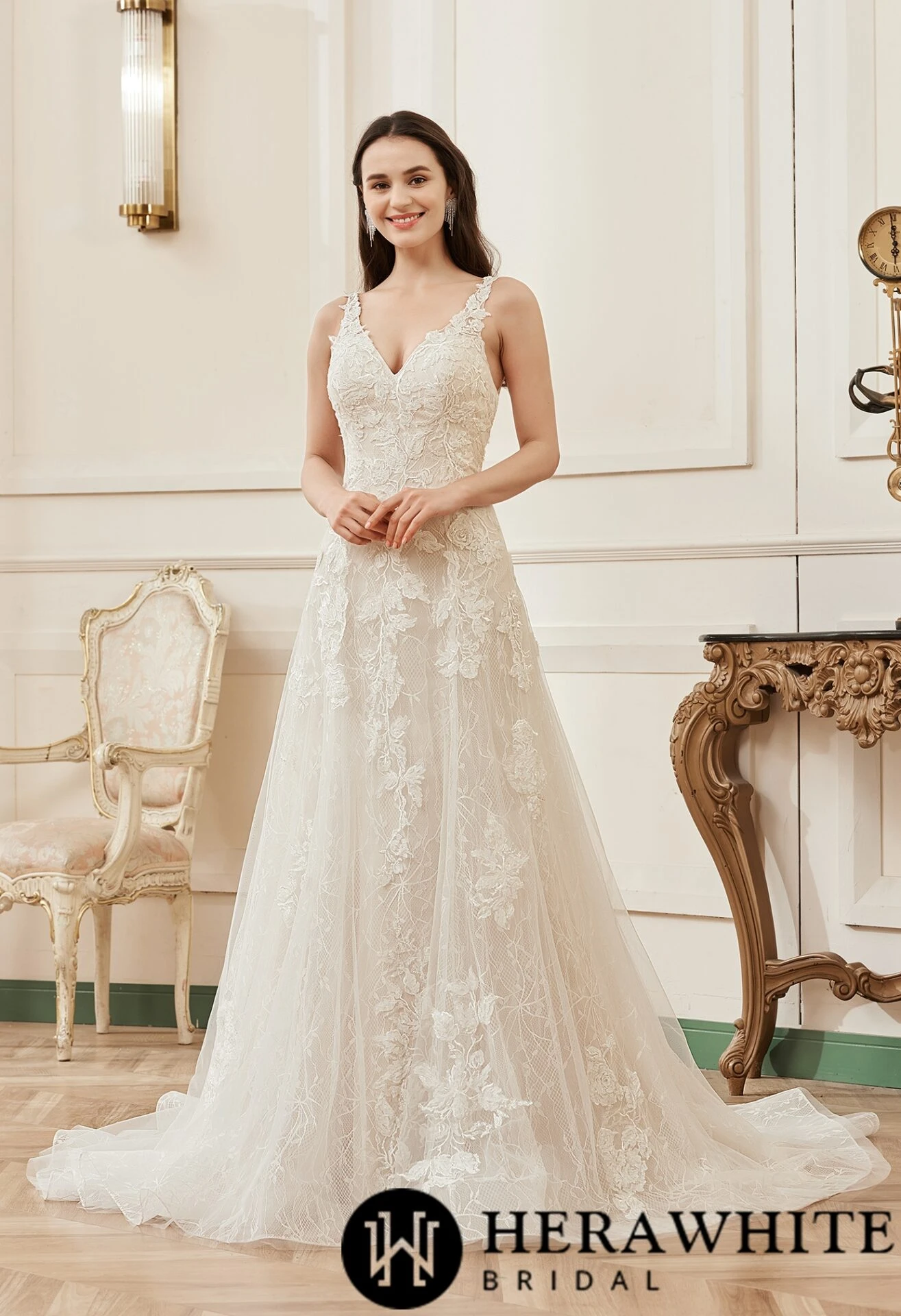 Cette merveilleuse Robe de mariée romantique à encolure en V avec appliques florales est la robe que vous cherchez ! Un style classique de ligne A orné d’une délicate applique de dentelle florale sur une couche de dentelle douce délicate en dessous pour créer la plus belle robe de mariée. L’encolure en V à bretelles transparentes et la traîne couronnée de crin de cheval accentuent l’allure romantique.