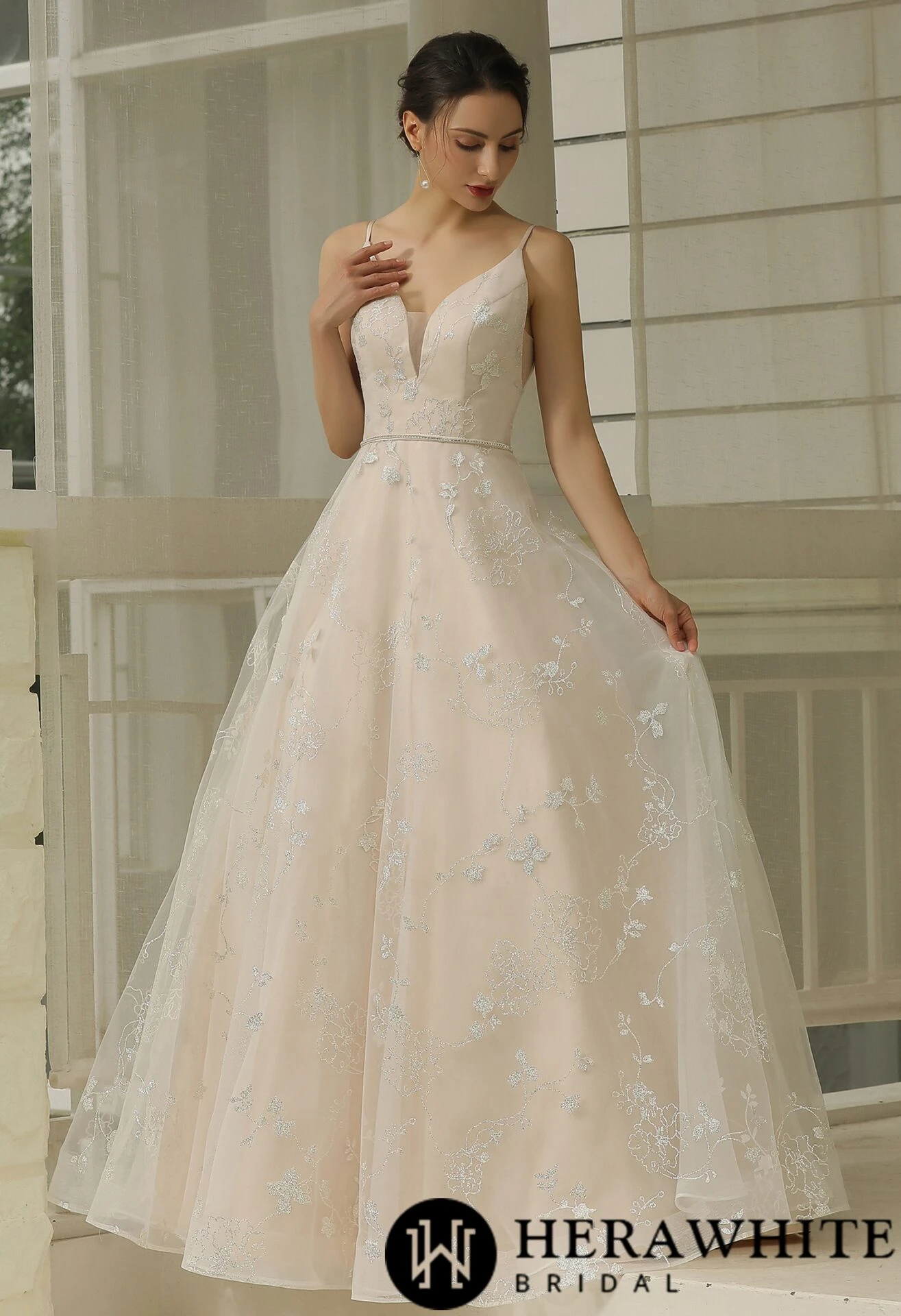 - Avantage : Robe de mariée simple à motifs floraux pailletés dos nu, ceinture, col V plongeant illusion, fines bretelles