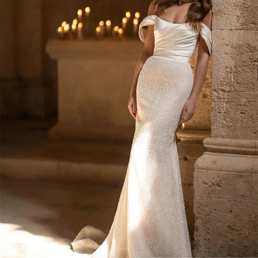 - Avantage : Robe De Mariée Sirène Avec Traine manches courtes tombantes, bustier, brillant, plis