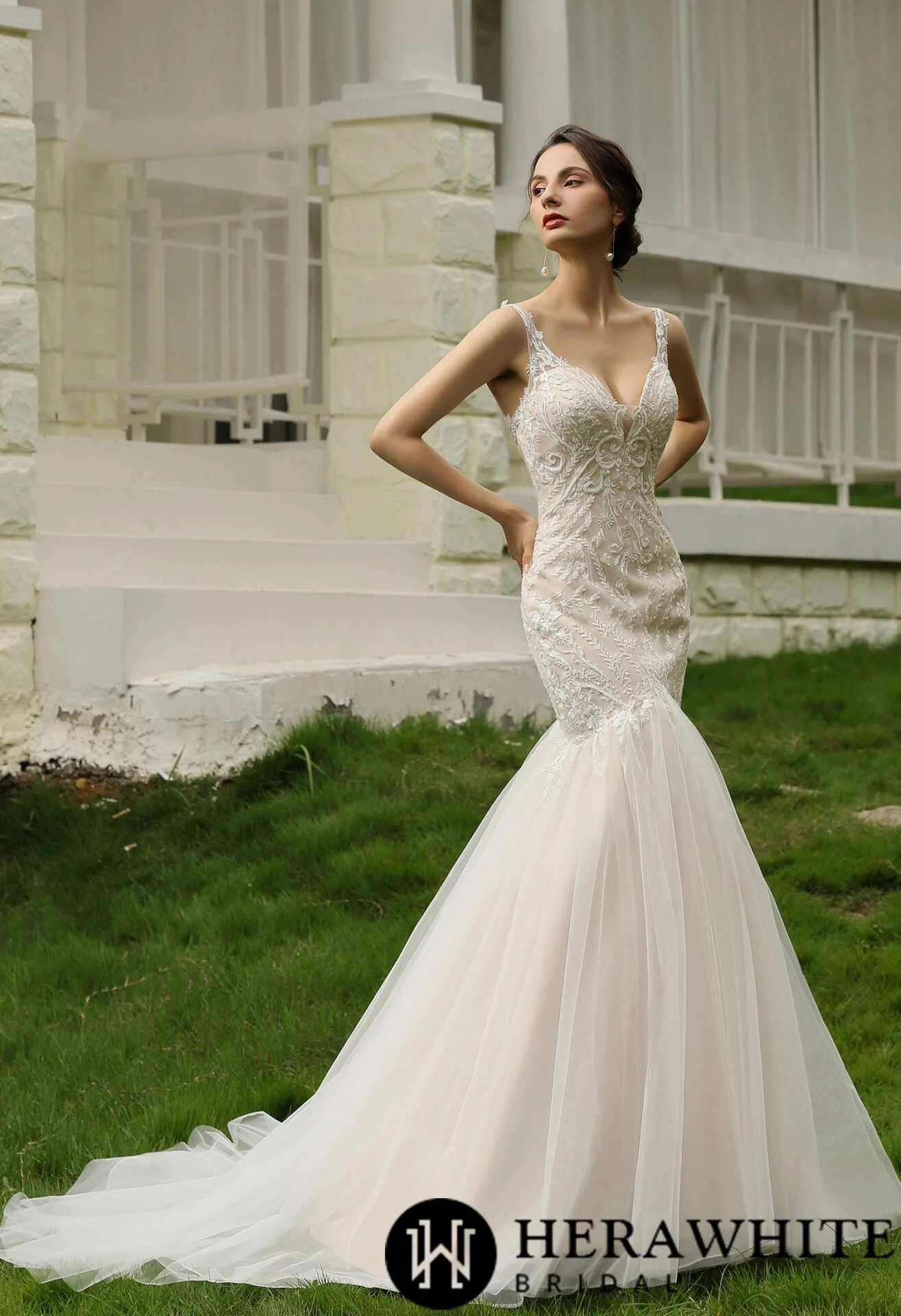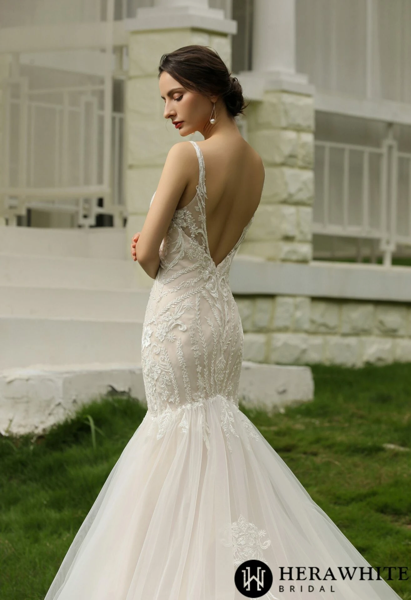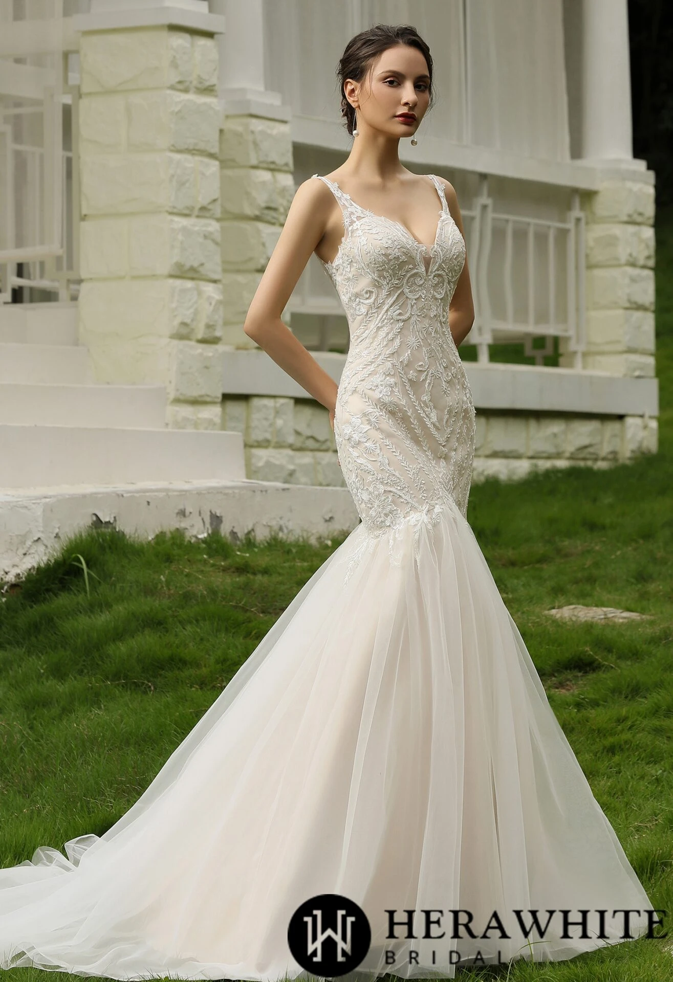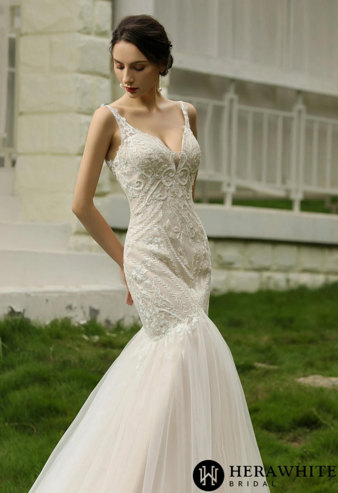 - Avantage : Robe de mariée trompette en dentelle perlée et tulle traîne, fines bretelles, col V, dos nu, motifs floraux